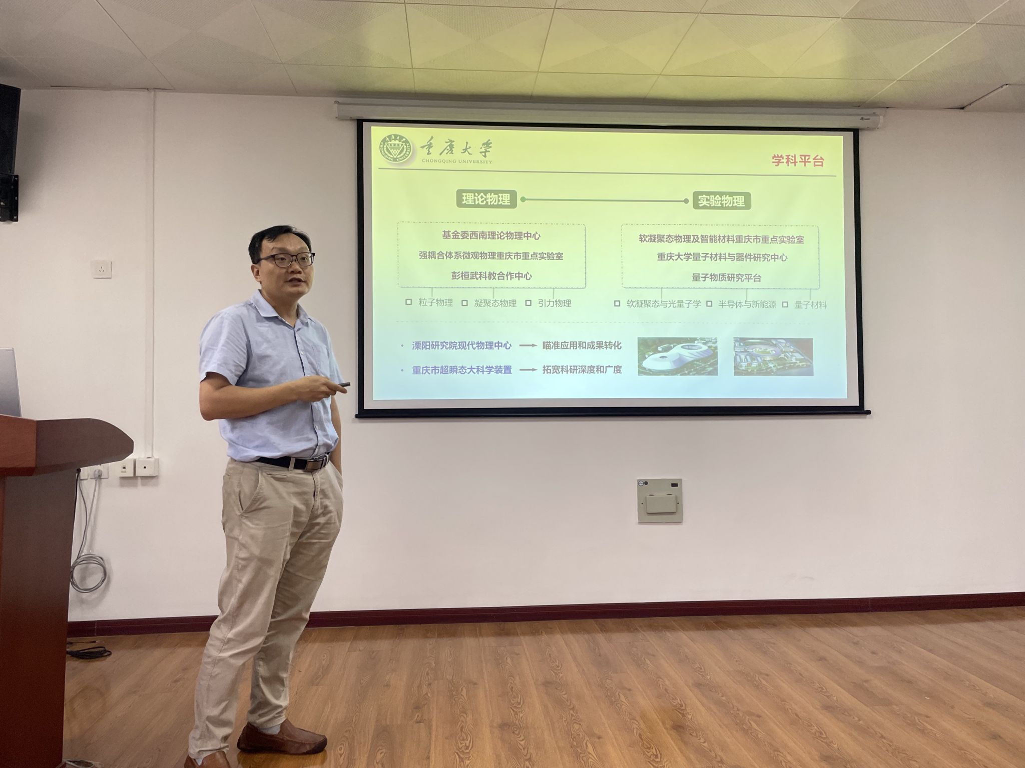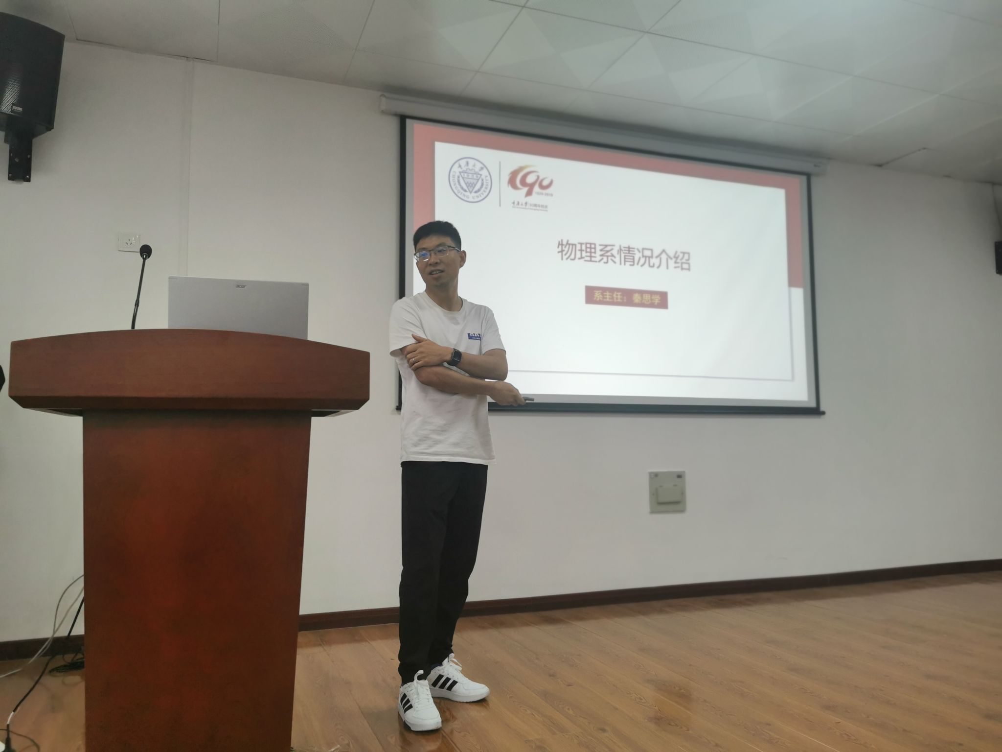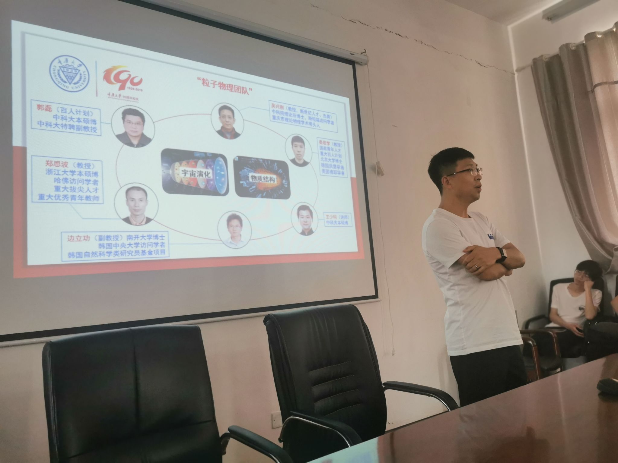 党委书记王更生教授和贵州民族大学物理系主任王声权教授主持。两次宣讲会吸引了近200名大三物理系的同学参加。胡自翔副院长从宏观经济形势、地区政策优势、学院发展态势和招生政策,校园生活环境等方面对我院物理学科做了整体介绍,并对我院暑期夏令营等活动进行了相关介绍;秦思学教授对物理系的师资和研究情况进行了详细的介绍,并对高能物理和粒子物理研究团队进行了详细的讲述;李昕教授对我院西南理论物理中心的发展和相关团队做了全面细致地介绍,并对天体物理与宇宙学方向进行了科普讲解和宣传。最后的答疑环节中,学生就推免生复试、奖学金、宿舍环境等问题踊跃提问,老师们一一解答并鼓励各位同学积极备考。
