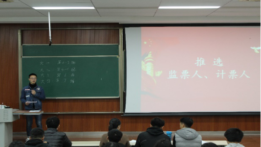大会进行第二项,推选监票人与计票人。由周兆炜同学当选总监票人,刘佳璇,马诩洋,王宇豪,邓惠中同学当选监票人。接着由与会成员推选国产偷拍