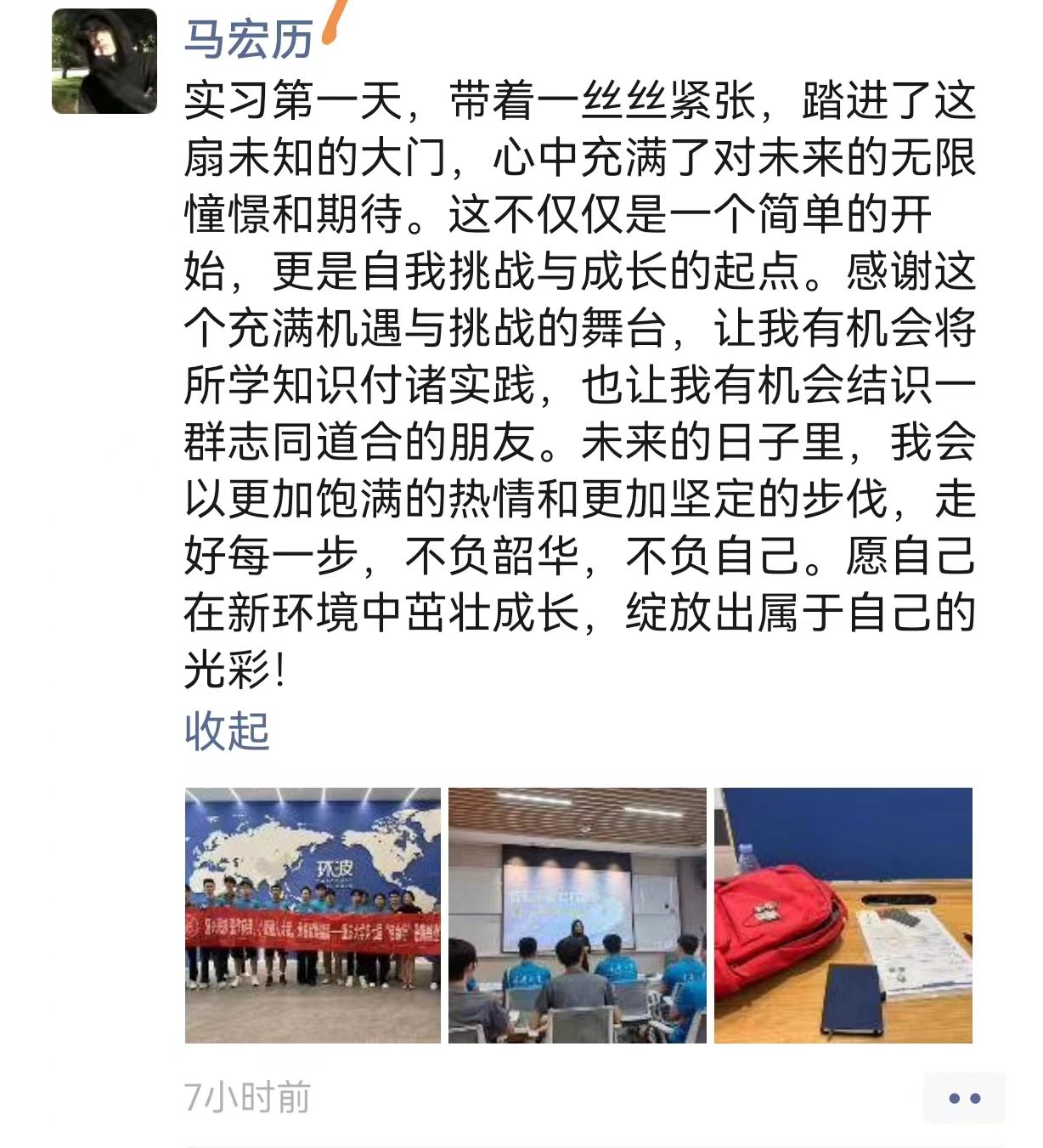 经过培训和参观,团队成员收获颇多,纷纷晒出了入职实习的欣喜和期待,接下来的一个月,他们将在各自岗位上锐意进取,精益求精,充分发挥自己的才能,努力成长为创新型、实用型和复合型人才。