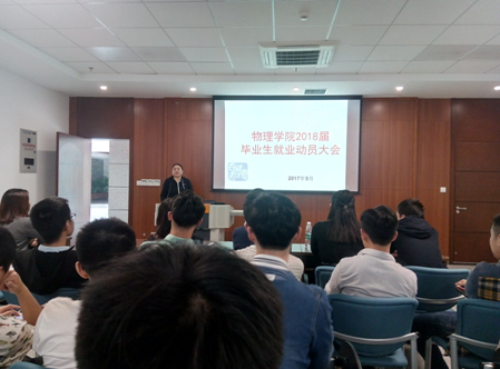 活动开始,萧老师指出,2017届毕业生毕业在即,而2018届的毕业生也到了吹响就业的号角的时刻。萧老师为同学们分析了往届毕业生的毕业去向,随着高校研究生招生的扩招以及严峻的就业形势,选择考研的同学队伍逐步壮大了起来。同时,选择出国深造的同学也大有人在。就业方面,萧老师针对我院学科特色进行了分析,电子专业的社会需求量大,大部分同学对口就业不成问题,物理专业方面,对口专业难求,但是大家也不用灰心,广开就业路,选择先就业在择业。
