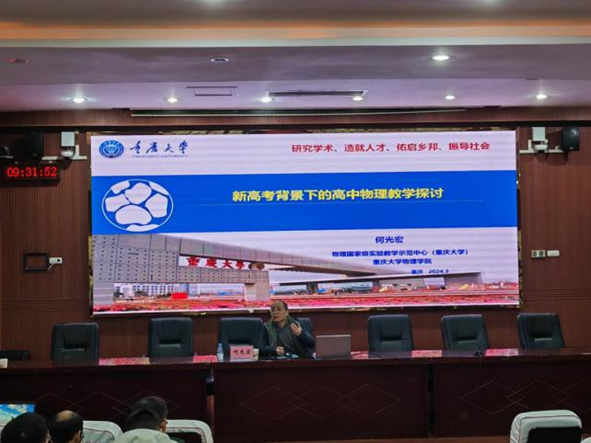 何光宏教授主讲,题为《新高考背景下高中物理教学探讨》。何教授是国家级物理实验教学示范中心主任,教育部大中物理教育衔接工作委员会委员,拥有丰富的物理教育经验。他深入浅出地为老师们剖析新高考评价,带领大家领会新课标精神、重点强调要因地制宜开展实验教学,最后他还对大学和中学的衔接作了介绍和交流。培训结束后,教师代表作了培训心得交流,他们表示何教授的培训为今后的物理教学工作提供新的思路和启发,今后会为学生创造更好的学习体验,培养学生的物理素养和科学精神。