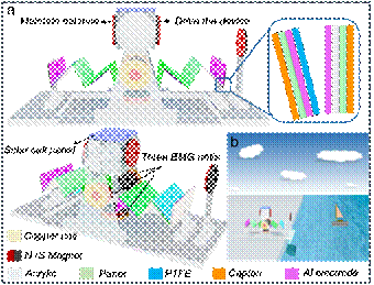 在众多的清洁可再生能源中,海洋蓝色能源覆盖面积广,约占地球表面70%左右,蕴含着巨大的能量。但如何高效经济地收集蓝色能源是其开发和利用仍面临的巨大挑战。新兴的基于摩擦起电和静电感应效应的摩擦纳米发电机(Triboelectric Nanogenerators, TENGs)对于随机低频率下机械能的收集(如海水表面低频机械能)有着独特的优势。过去几年间,已研究出的基于摩擦发电技术的蓝色能源采集装置, 可将其大致分为两类:一类是固-液接触型,一类是全封装的固-固接触型。然而,对于固-固接触型发电机,一方面封装困难,封装成本高是实际应用面临的首要问题,另一方面封装以后,发电机内部出现故障,拆卸和重组装也是非常困难的。因此如何高效稳定地采集蓝色能源是摩擦纳米发电机走出实验室,投入实际应用,大规模,产业化首先要解决的问题。