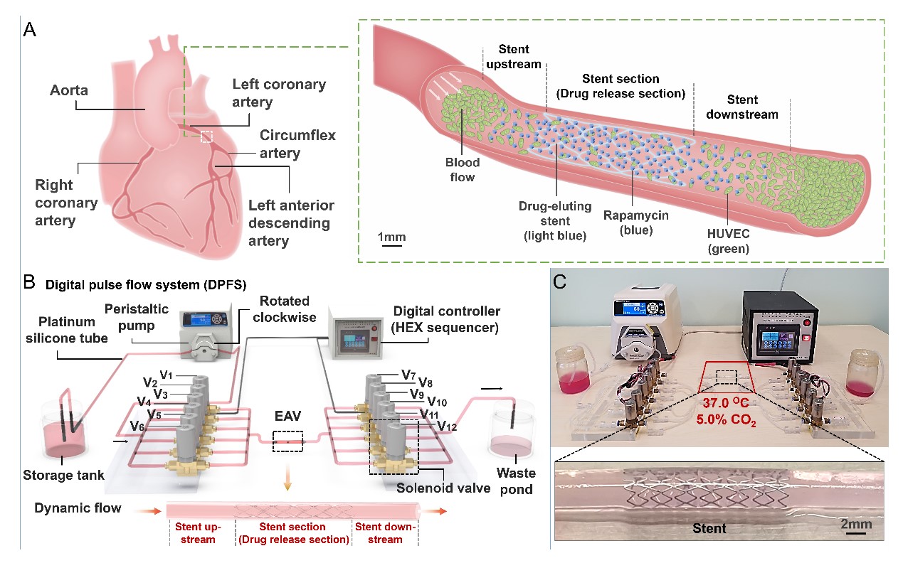 刘雳宇教授与首都医科大学附属北京安贞医院彭红玉、重庆海吉亚肿瘤医院张鸿飞课题组等合作,在体外构建了基于数字脉冲系统和弹性类血管模型的一体化实验平台,可用于评估支架类型对心血管狭窄病变术后的二次狭窄与血管痉挛风险。该研究工作发表于微流控领域顶级期刊《Lab on a chip》,国产偷拍