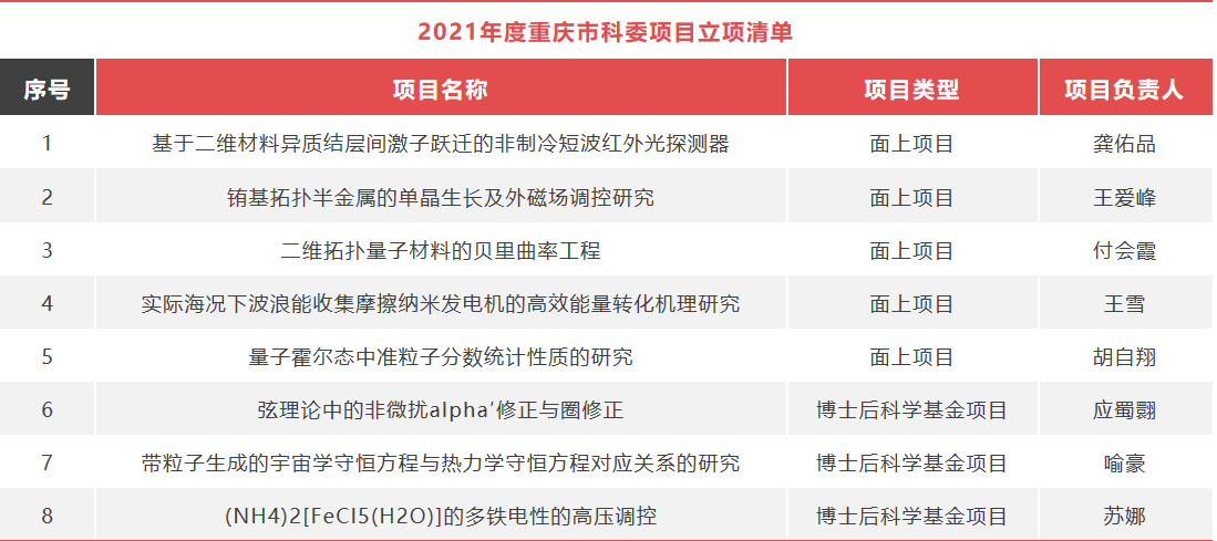 近日,重庆市科技局发布了《2021年度重庆市自然科学基金专项拟立项清单公示》,我院立项重庆市自然科学基金面上项目5项、博士后科学基金项目3项(见附表)。据悉,国产偷拍 共立项2021年度重庆市自然科学基金面上项目106项、博士后科学基金项目46项。