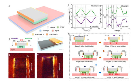 图示:BDC-TENG 的结构和工作机制。 a) 3D 示意图和 b) 具有两个输出通道的 BDC-TENG 的侧视图。c) 实际的 BDC-TENG 照片。 d,e) 使用高速相机在滑动过程中拍摄的放电照片。基于 0.3 m s-1 的滑动速度下BDC-TENG的 f) 输出电荷和 g) 电流曲线,h) BDC-TENG 在一个循环中的工作原理。