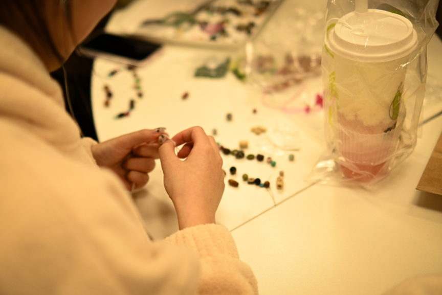 活动伊始,女同学们欢聚一起DIY手串,将一颗颗普通的珠子,变成独一无二的艺术品,在亲手制作手串的过程中,大家沉浸其中,讨论生活和学习,一片欢声笑语。
