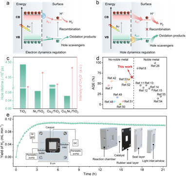 图1.(a)电子动力学调控和(b)空穴动力学调控策略,(c)不同样品空穴寿命和CH3O−的产量,(d)该工作与文献TiO2基光催化剂表观量子产率对比,(e)自制流动相反应器。